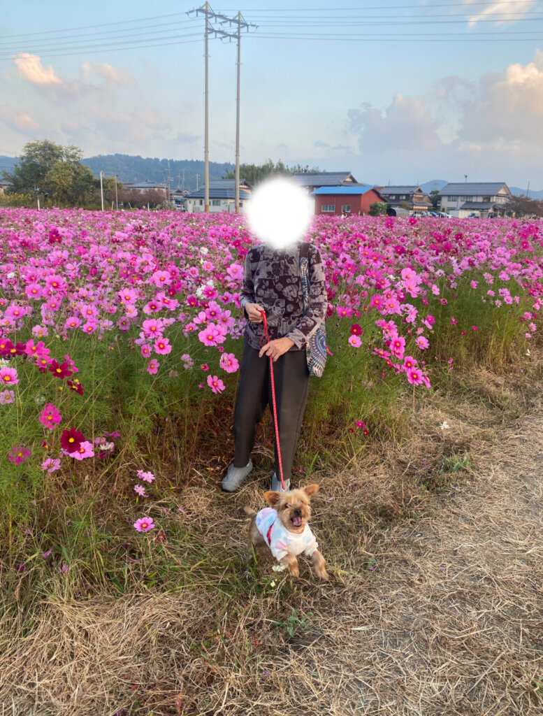 私も祖母と一緒に訪れたのですが、写真を撮ろうとすると犬が大喜びで、この表情!まるでコスモスのきれいさが伝わっているみたいで、思わず笑ってしまいました。