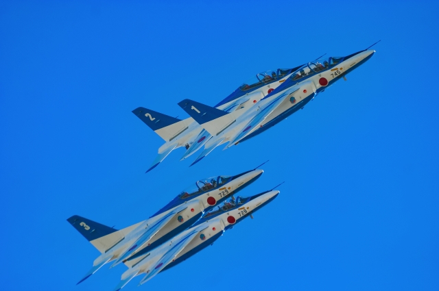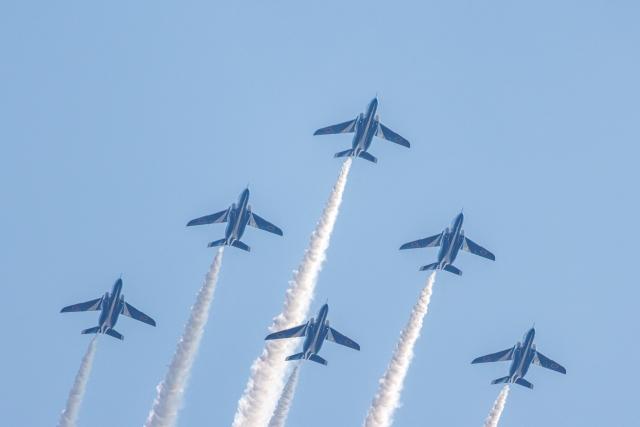 ブルーインパルスは、航空自衛隊の存在を多くの人に知ってもらうために結成されたアクロバット飛行チーム。航空祭や国民的なイベントで披露される華麗な飛行は「展示飛行」と呼ばれていて、青と白にカラーリングされた6機の機体が、大空を舞う姿は圧巻!!ダイナミックなパフォーマンスで大人気なんです。